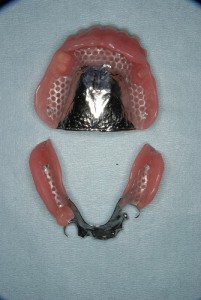 義歯を使っておいしく・痛くなく物を食べるには、咬み合う力によってたわまない材料で義歯を製作する必要がありますが、樹脂(プラスチックのような材料・樹脂の中にも様々な種類がある)だけでは咬む力に耐え切れず、壊れてしまったり痛くなってしまうことがあります。そのような場合、金属のプレートによって補強した義歯(金属床)を提案することがあります。