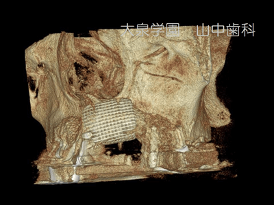チタンメッシュを設置下のCT画像は術後約3か月後の経過画像になります。チタンメッシュの形がはっきりとわかります。通常のレントゲンではここまでのイメージは出来ません。やはりインプラント関連の手術の術後経過を調べるためには3次元のイメージが有効だと考えています。