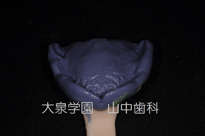 まずは①印象採得(歯の型取り)のステップ。 患者さんのお口にあった個人トレーを作製し、コンパウンドという材料を用いて筋形成(お口のまわりの筋肉の動きを印象することで、口を動かしても義歯が落ちないように印象していく印象採得方法です)をします。印象採得の直前に仮の材料で適合を確かめる事で、精度の確認を行います。 精度に問題がないことを確認した後、シリコーン印象材による精密印象を行います。